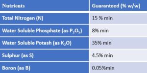 - Useful specially for healthy vegetative growth, flower and Fruit / Nut setting and Fruit / Nut Maturity.